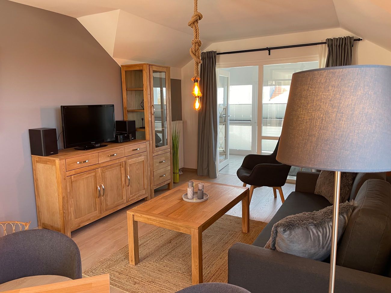 • Wohn- und Esszimmer: (Polstergarnitur, Couchtisch, Anbauwand, Esstisch mit 4 Stühlen, TV, Radio)