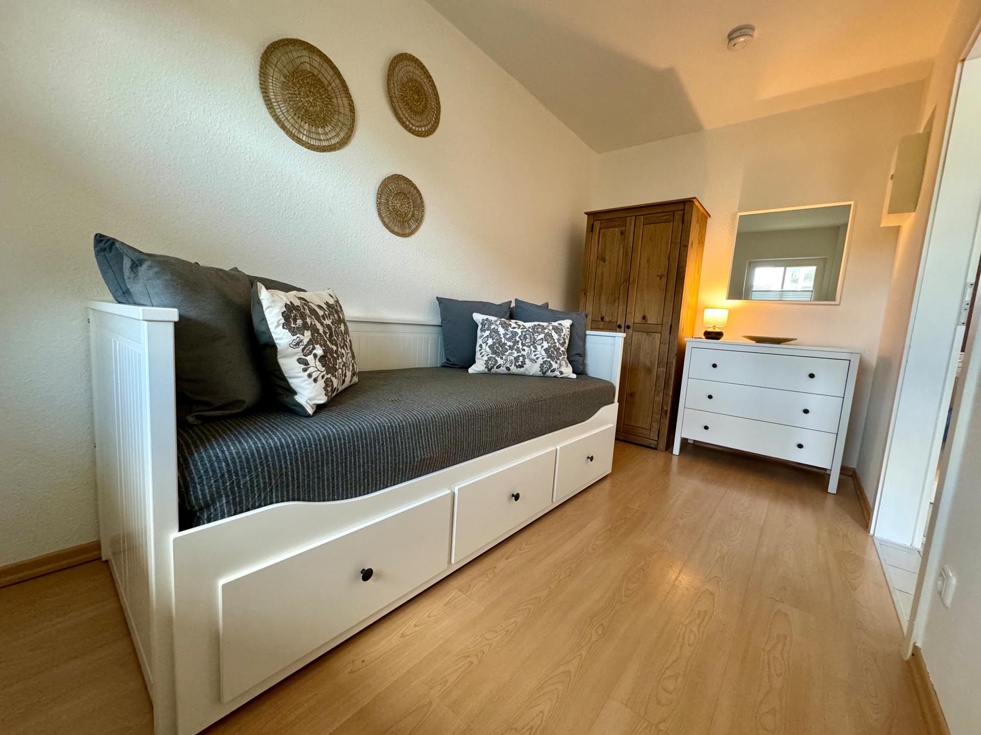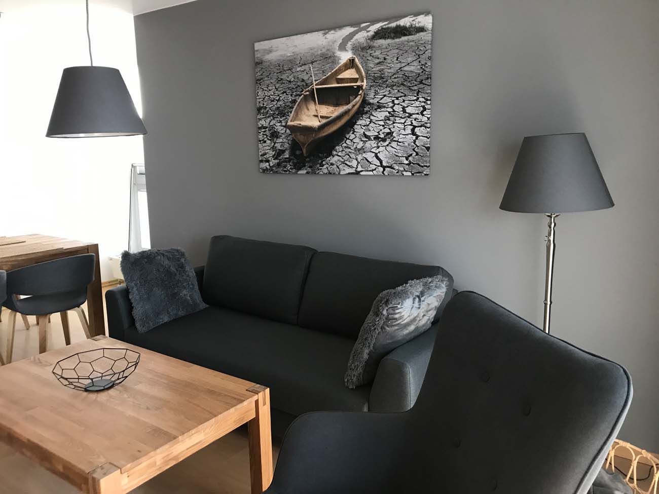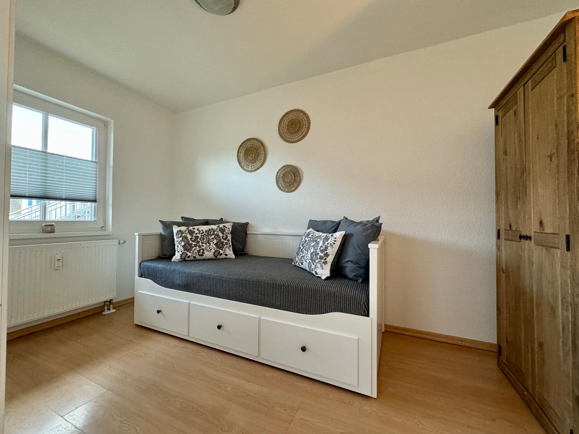 Die in 2019 für Sie neu renovierte und mit Liebe ausgestattete Ferienwohnung verfügt über einen gemütlichen Wohn- u. Essbereich für 4 Personen, einem Schlafzimmer mit Boxspringbett 180x200, einem Kinderzimmer mit einem ausziehbaren Tagesbett (ausgezogen 160x200 für 2 Personen), einer abgeschlossenen Küche, einer Garderobe, einem Abstellraum, eine geschlossene Veranda mit zusätzlicher Sitzgelegenheit, welche zum Verweilen und Chillen einlädt. Im Wohnbereich befindet sich eine hochwertige Boxspring-Schlafcouch (ausgezogen 160x200), welche gerne von weiteren ein bis zwei Personen genutzt werden kann. Die Ferienwohnung ist ideal geeignet für 2-6 Personen (+1 Kleinkind) Zusammenfassung: