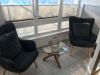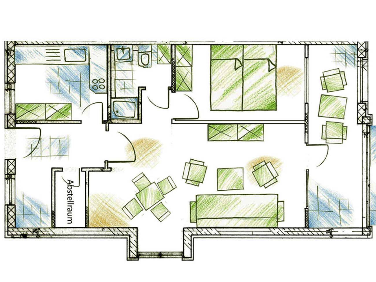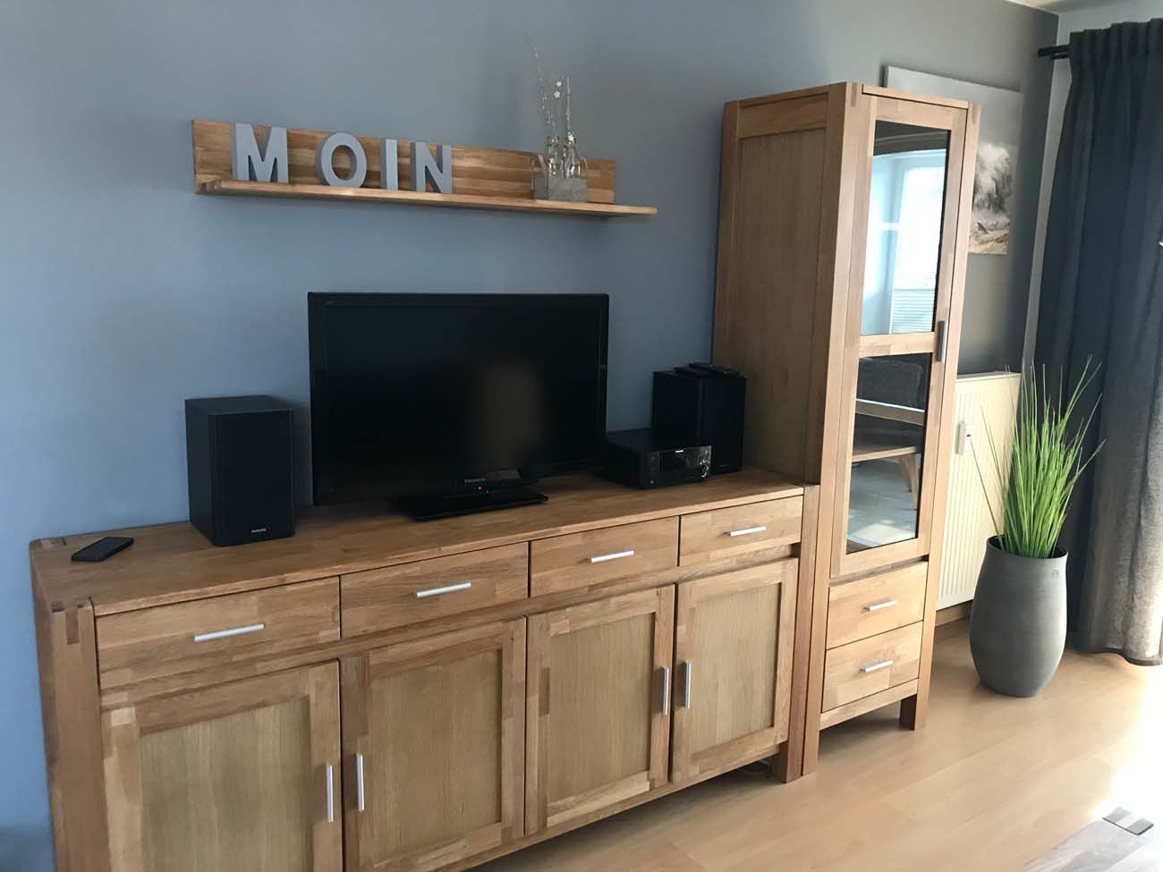 • Wohn- und Esszimmer: (Polstergarnitur, Couchtisch, Anbauwand, Esstisch mit 4 Stühlen, TV, Radio)